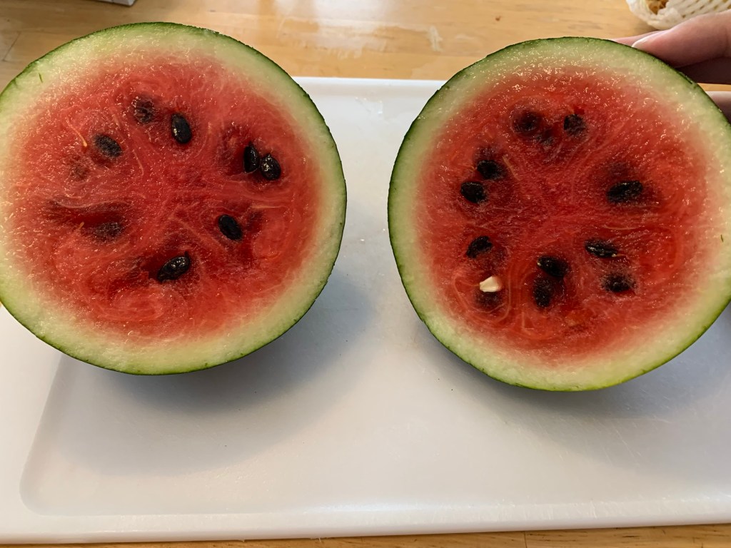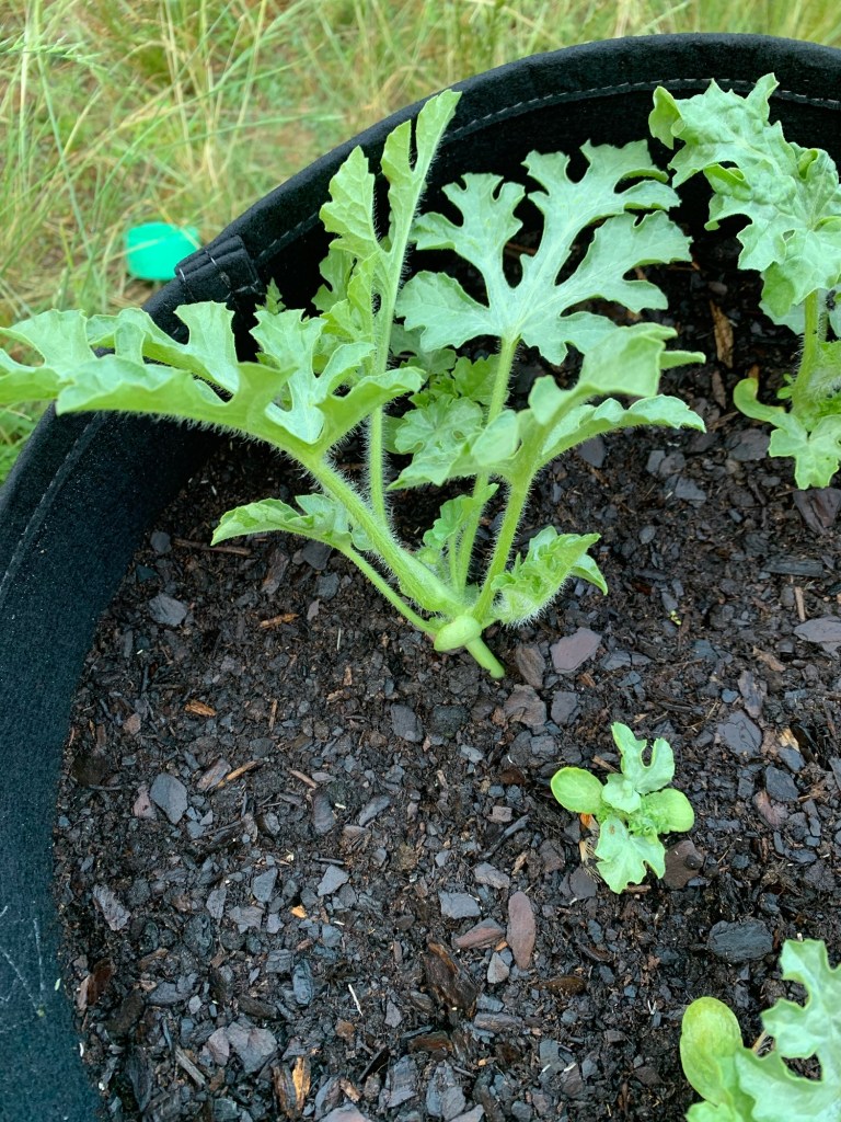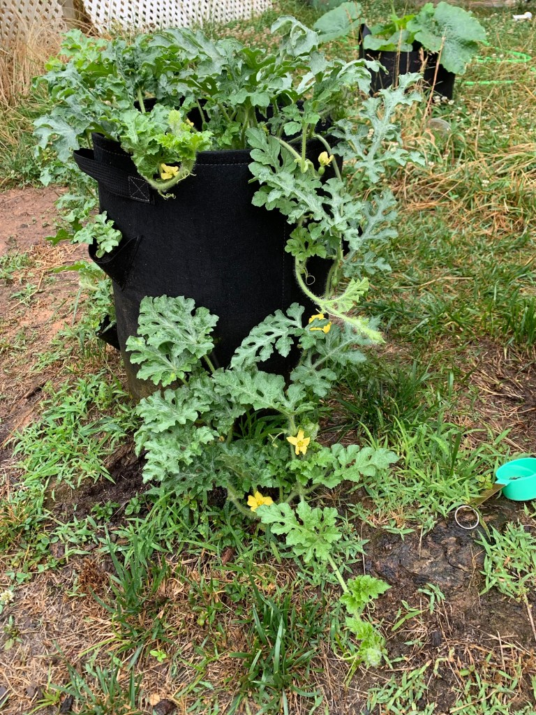 Because I knew that the watermelons were heavy drinkers and feeders and being planted too close together, I watered them with a gallon of water mixed with a tablespoon of liquid kelp fertilizer every morning. The grow bag, helps with water drainage and keeps the plants from becoming root bound… I didn’t think it would work but the results were amazing!