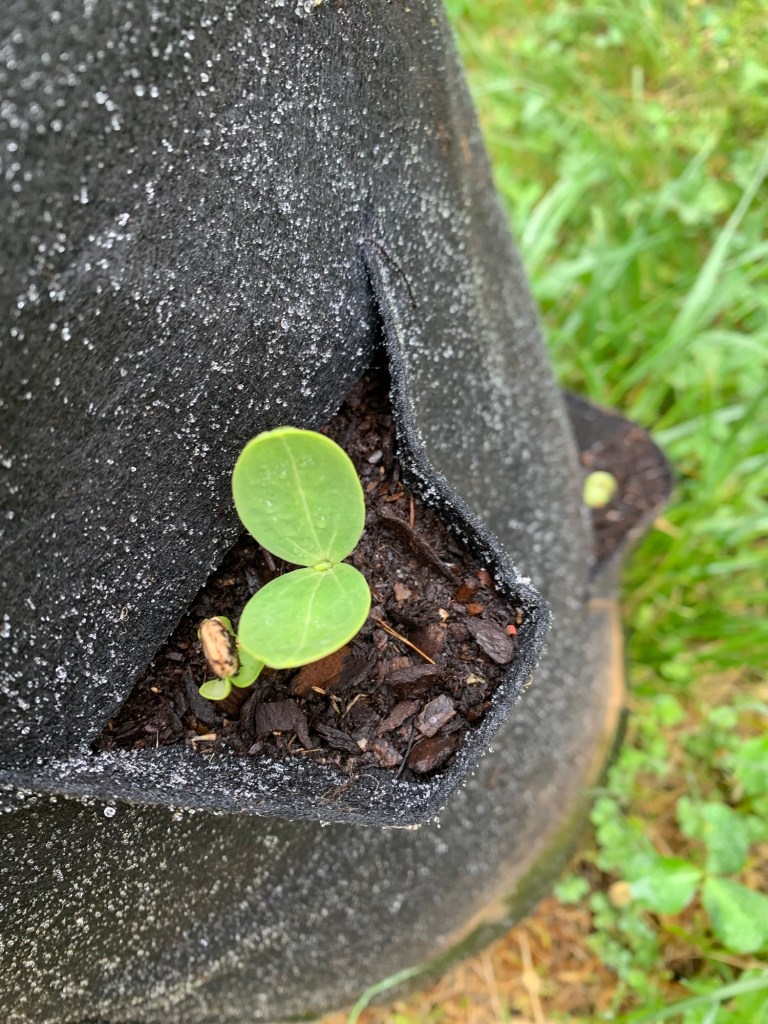 Anyway last year I came across the seeds I had put up and saw they were about to expire. Not really wanting to throw them away… or do anything special I decided to plant them in a strawberry grow bag I had. This grow bag had about nine holes… and each hole I planted three seeds of bush baby watermelons from bakers creek seeds.